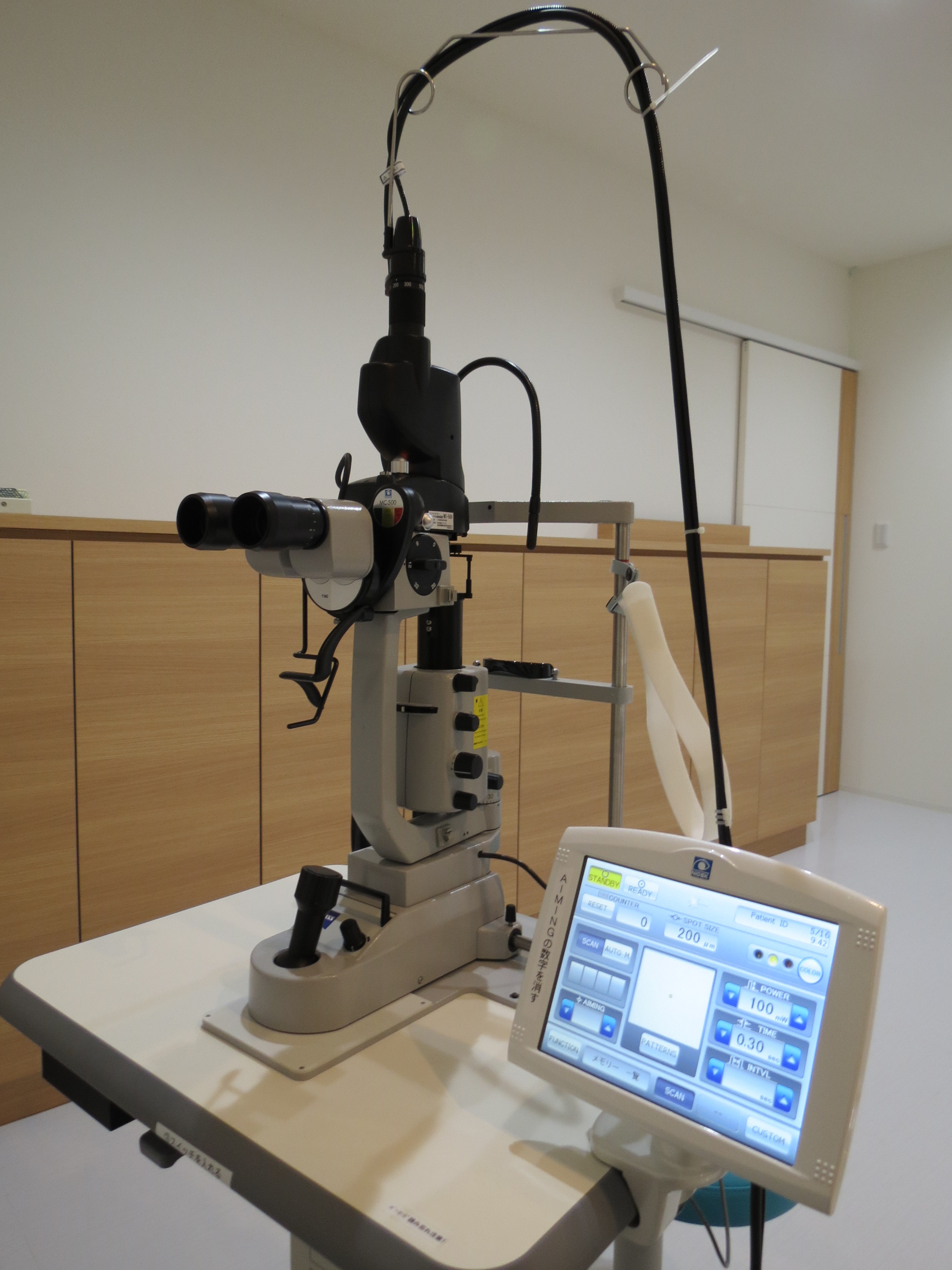 糖尿病網膜症、網膜静脈分岐閉塞症、中心性將液性網脈絡膜症、網膜裂孔等の疾患に対する治療に使われる装置です。また適応症例に対しては、1回のレーザーの照射で複数個所の凝固ができるパターン照射機能も搭載しており、従来よりも痛みの少ないレーザー治療が可能です。