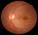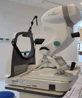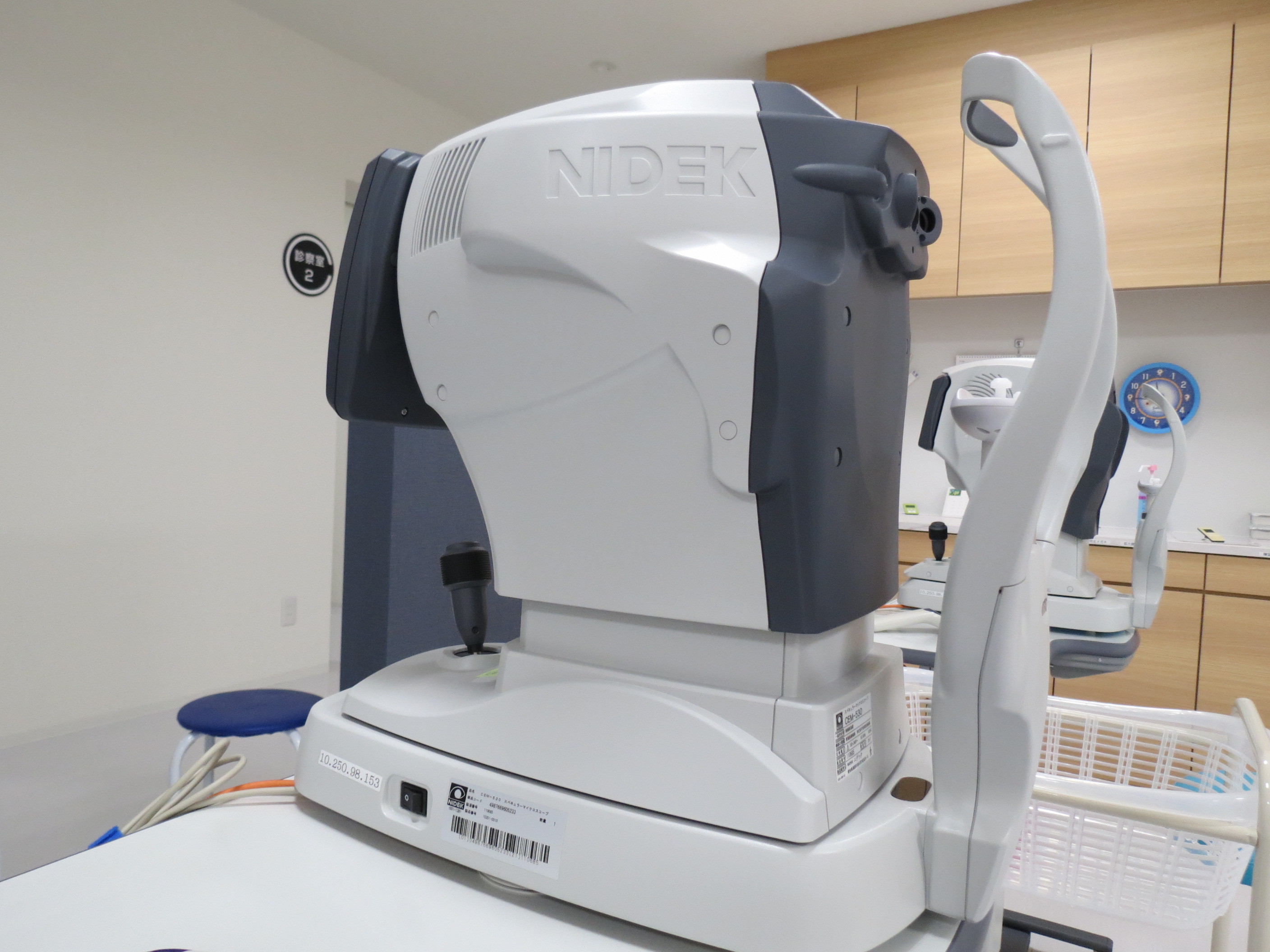 眼底(網膜)の写真を撮る事で、眼底の血管の大きさや走行、出血の有無、網膜の浮腫や剥離等を調べる装置です。また高血圧症、動脈硬化、緑内障等を発見できます。更に腕の血管に造影剤を注射して眼底の血流を観察する蛍光眼底造影検査もできます。これにより糖尿病網膜症などに見られる新生血管や血管の閉塞等を見つける事ができます。