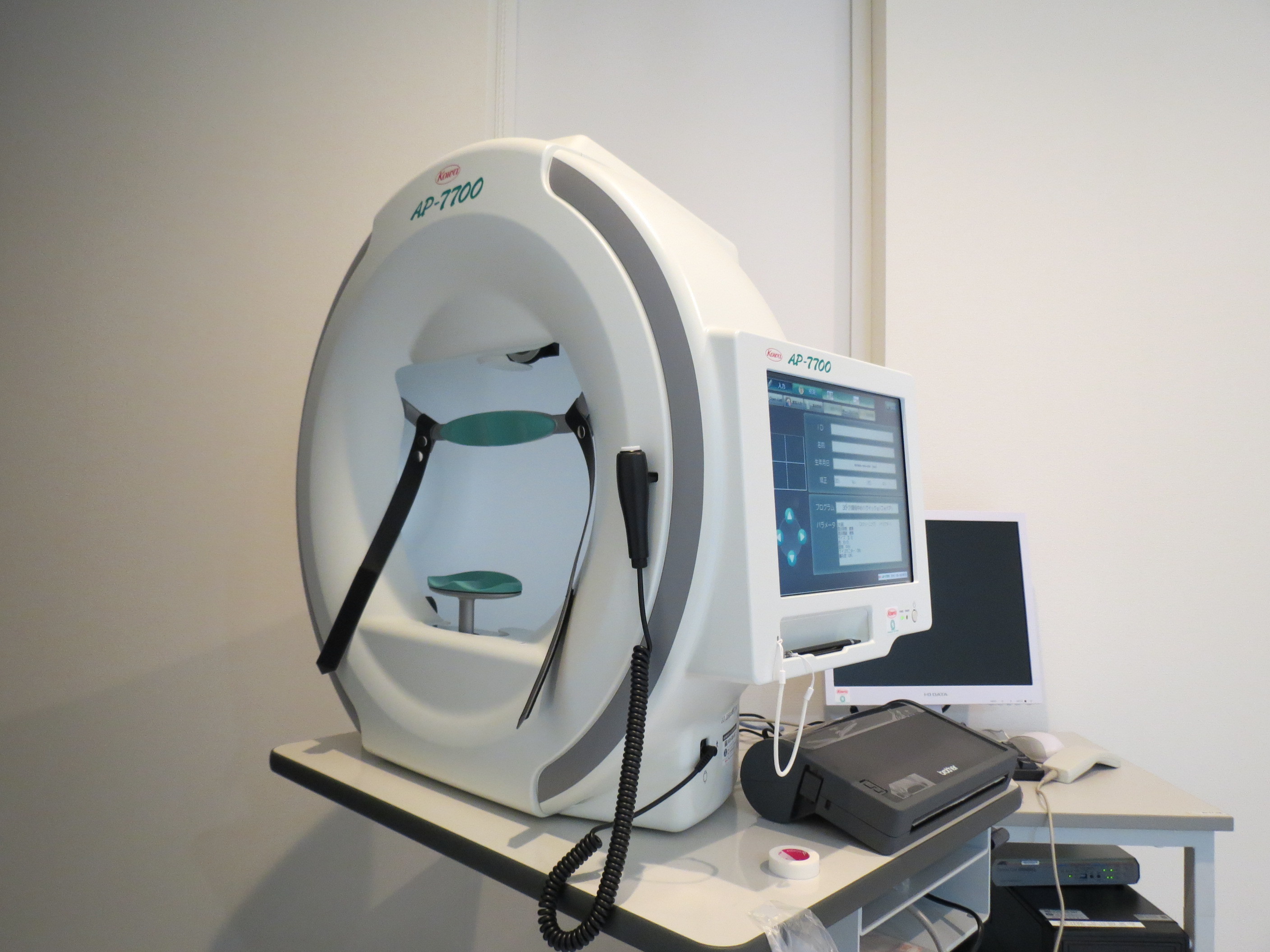 見える範囲と網膜の光の感度を測定する装置で、1台で静的視野検査と動的視野検査ができます。主に緑内障、網膜疾患、視神経疾患等の発見・診断や経過観察に使用します。