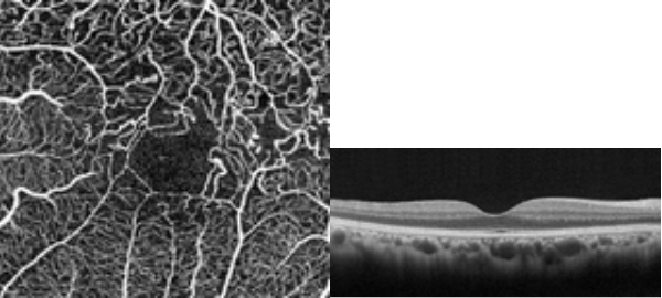 光干渉の原理を用いて網膜の断層像を測定する装置です。網膜の各層の形態を詳しく見る事ができる為、網膜の浮腫・剥離・出血等の範囲を観察する事ができ、網膜疾患の評価に非常に有用な機械です。また網膜疾患だけではなく早期の緑内障の発見や、進行の評価を他覚的に捉える事もできます。更に造影剤を用いないで眼底の血流機能を観察する機能(OCT Angiography)も有している為、造影剤が使用できない患者様への眼底血流検査も可能となります。