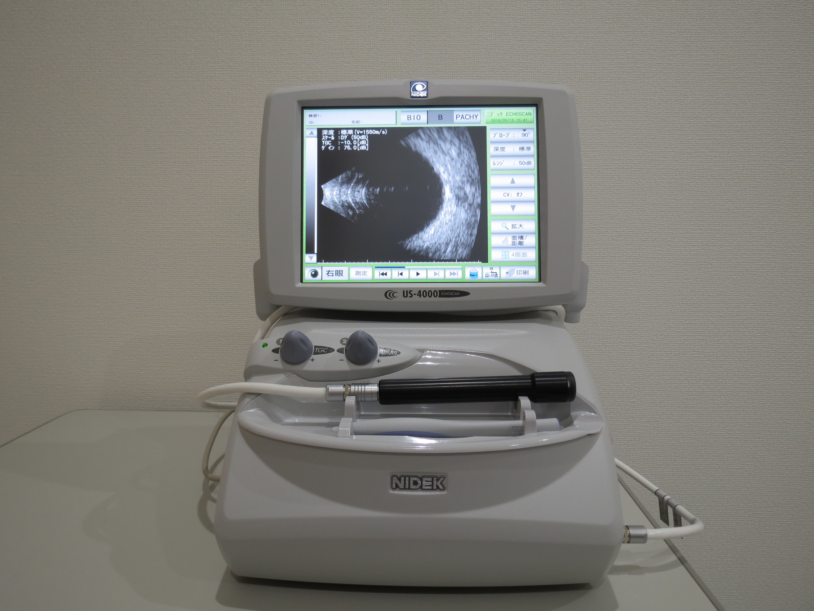 超音波を用いて眼球内及びその周辺の形状・動態を測定する装置です。白内障や硝子体混濁等により眼底に光が届かない眼の観察に有用です。