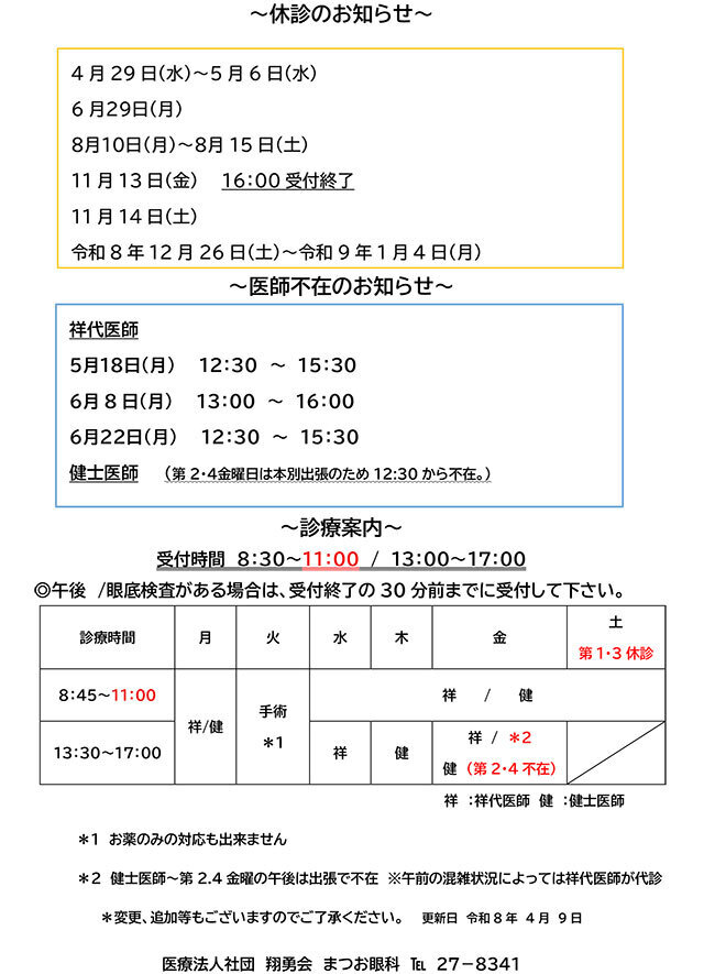 | メガネ合わせ、コンタクトレンズの処方につきましては診療案内をご覧下さい。 |